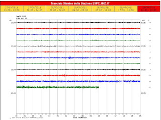 Amilyen hirtelen felerősödött, olyan gyorsan csendesült el az Etna kitörése. A baloldali szeizmogramon látható, mennyit jelentősen gyengültek a földrezgések. Forrás: INGV